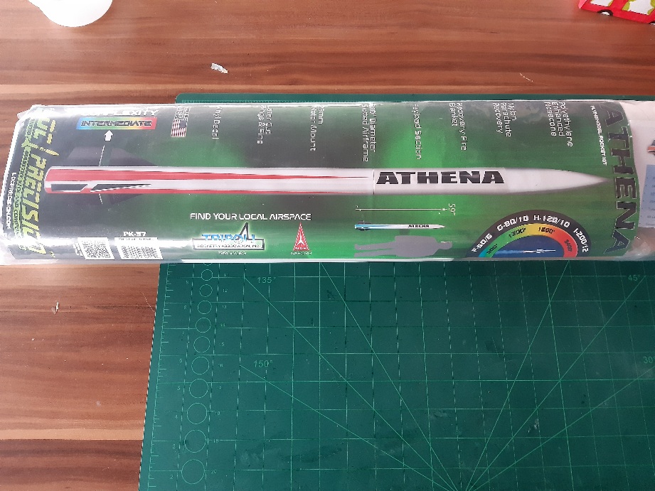 Hallo, Nachdem ich hier schon viel gelesen habe, möchte ich euch nun auch an meinem Projekt teilhaben lassen. Ich möchte nach etlichen kleineren bis mittleren Raketen einen Schritt weiter gehen. Daher jetzt die Athena von LOC. Ziel ist es die Rakete beim RJD auf einen Aerotech G79-4W zu starten. Laut OpenRocket sollte dies für den Erstflug optimal funktionieren. Also erstmal alles Auspacken.  Die Körperrohre, Flossen, Spanien, Fallschirm und Shockcord machen einen guten Eindruck. Die Spitze braucht leider viel Schleifarbeit und Filler damit sie glatt wird. Das E im Schriftzug ist nicht komplett, da muss ich mir was überlegen. Gruß Benni