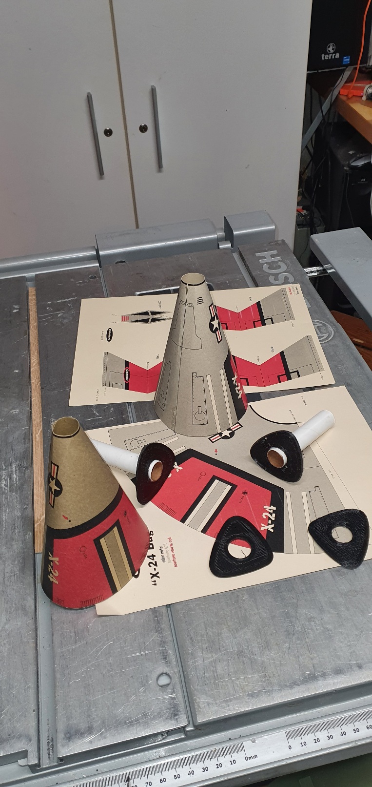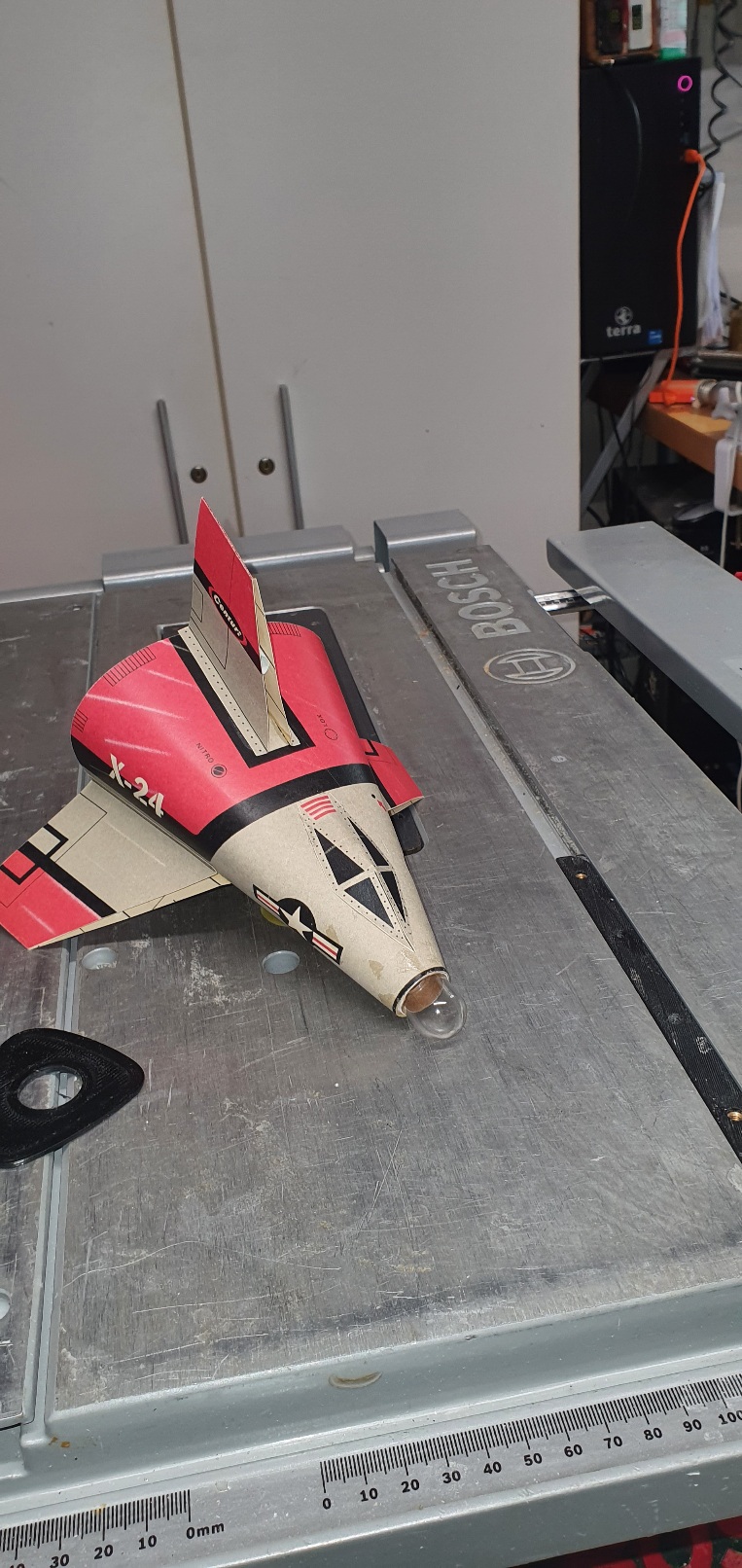 Beim stöbern auf der JimZ Seite ist mir die X-24 Bug in die Hände gefallen. Ich konnte mich daran erinnern, dass das Modell immer für sehr viel Spaß gesorgt hat. Die Flugbahn wahr allerdings nicht immer vorher zu sagen. Vieleicht wird es jetzt besser. Da der Spant von der Seite von Jim nicht so toll ist, habe ich ihn neu gezeichnet und ausgedruckt. Wer möchte kann den File bekommen. Bastelbogen auf Trennblatt Karton ausgedruckt. Spant 2mm ABS Boddy und Motorröhren verklebt .  und alles zusammen fügen.