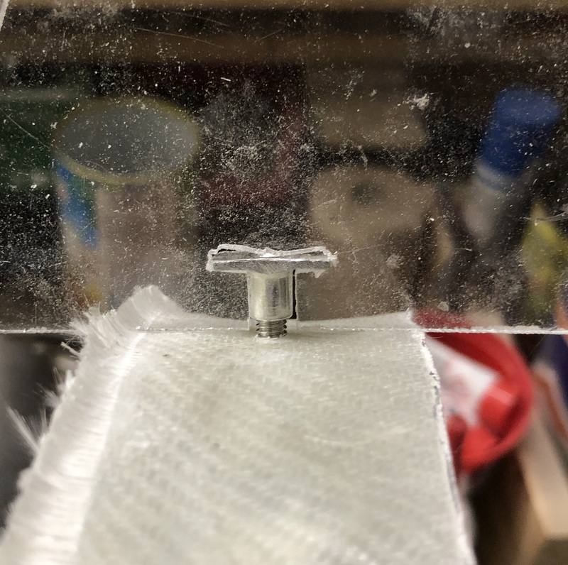 Ich habe mal Versuche gemacht, wie ich gedenke die 4 Chine mit integrierten Acryl-Hilfsflügeln zu bauen. Von 4mm Einschlagmuttern säge ich zwei Seiten ab. In dem Acrylflügel säge ich eine entsprechenden Ausschnitt aus und passe die Mutter ein. Jetzt kann ich den Flügel senkrecht auf das Rohr schrauben. S zusätzlich werde ich mit Epoxy auf beiden Seiten noch eine Sicke ziehen. Dann kommen noch die schräg angeleimte Verkleidung hinzu.