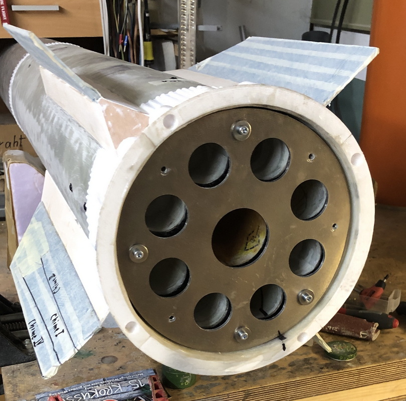 Na Logo, das kommt mit in meinem Werkzeugkoffer. Da kommen noch andere Schrauben rein. Die unter der Motorenhaltescheibe liegenden Abstandsstücke fallen bei der Horizontalmontage immer wieder runter. Jetzt habe ich sie mit Doppelklebeband arretiert. Ganz blöd ist es wenn so ein Abstandsstück oder eine Schraube durch ein offenes Motorrohr bis in die Tube fällt. Man bekommt es ganz schwer wieder raus. Ich werde da ein paar Montagedeckel aus Pappe herstellen, um so etwas vorzubeugen.