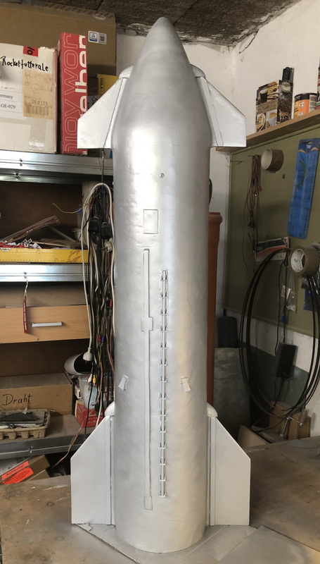 Nachdem ich den Booster wieder drehbar gelagert hatte, habe ich mich getraut zu lackieren. Wenn er trocken ist gehe ich nochmals drüber. Die Scaleelemente vom Starship sind nun ebenfalls draufgeklebt. Ciao, Rolli