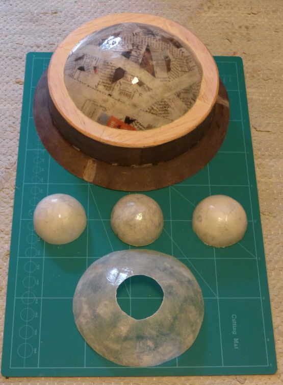 Die Halbkugeln sind jetzt fertig und die Haube zusammengeklebt. Ich bin mit dem Ergebnis sehr zufrieden. Wenn man auf die Luftballons erst Papierstreifen mit Tapetenleim klebt und dann erst laminiert, kann man das sehr schön wieder vom Luftballon abnehmen: