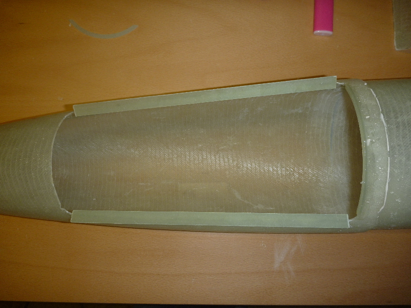 Die Klappe für den Hauptfallschirm hab ich mit dem Dremel per Hand rausgeschnitten. Ziemlich schief und krumm ist der Ausschnitt daher, und das Spaltmaß viel zu groß. Damit die Klappe später auch schön passt, habe ich auf die Kanten des Ausschnitts GFK-Leisten geklebt. So kann dann die Klappe genau angepasst werden: