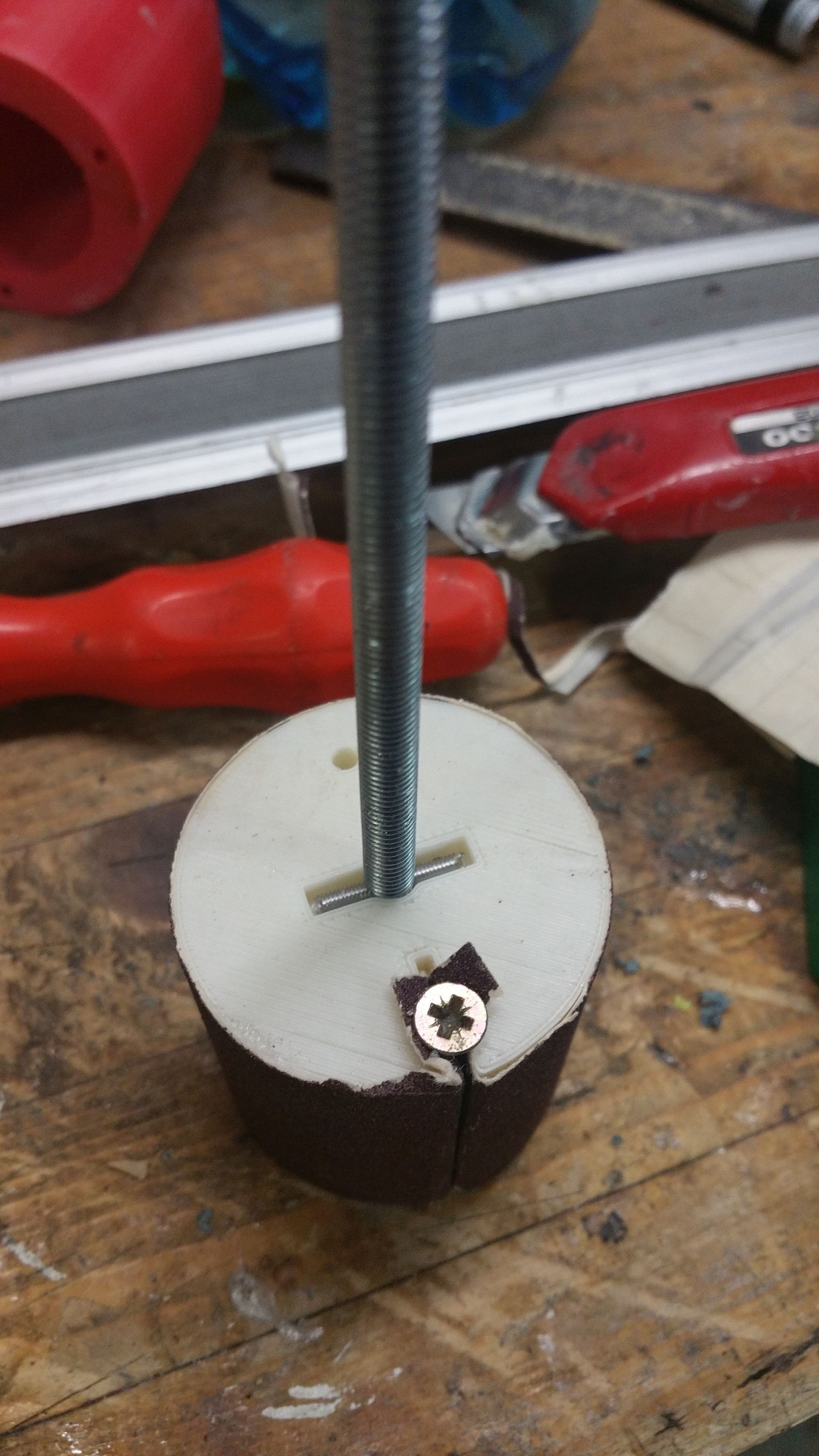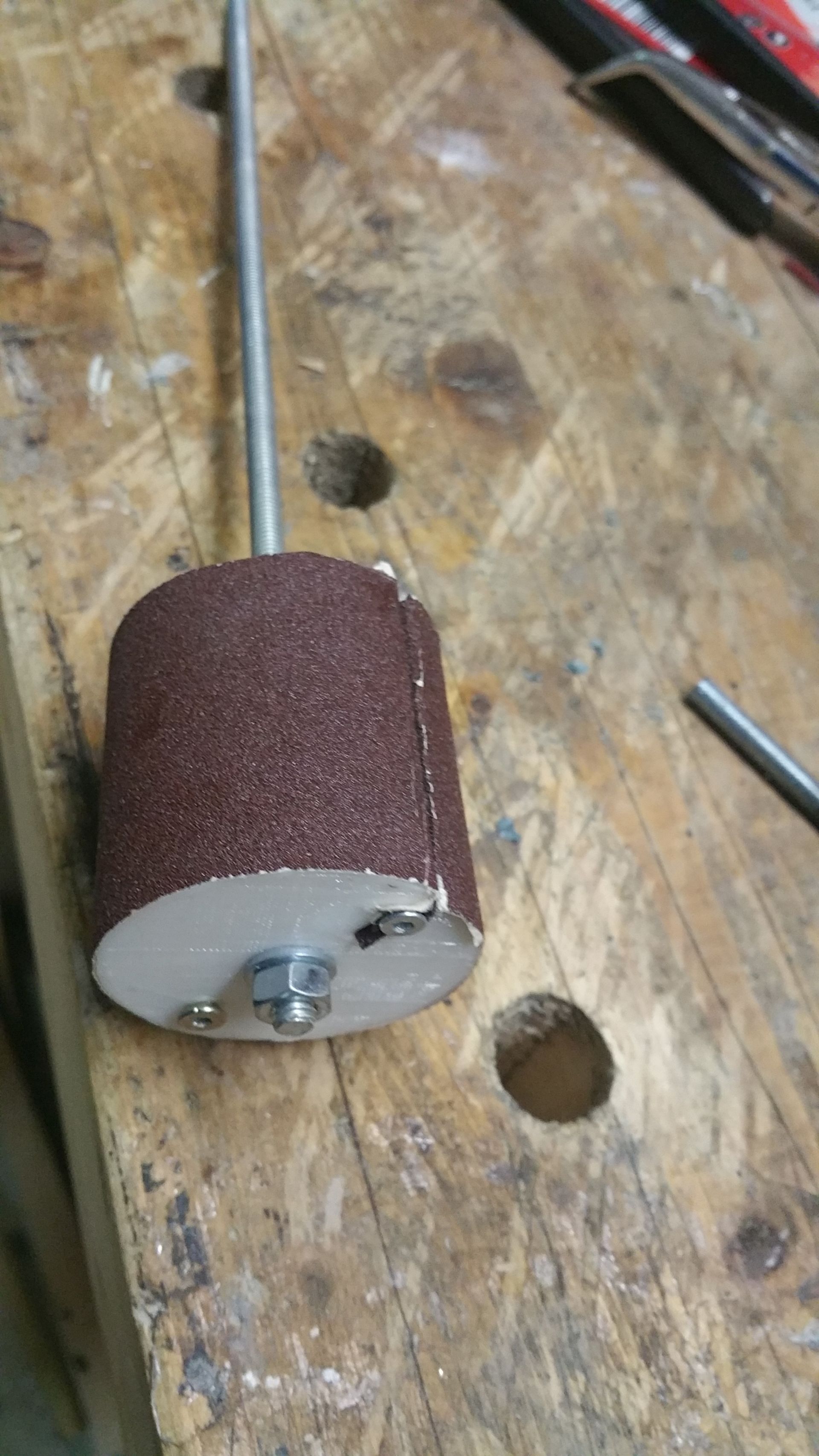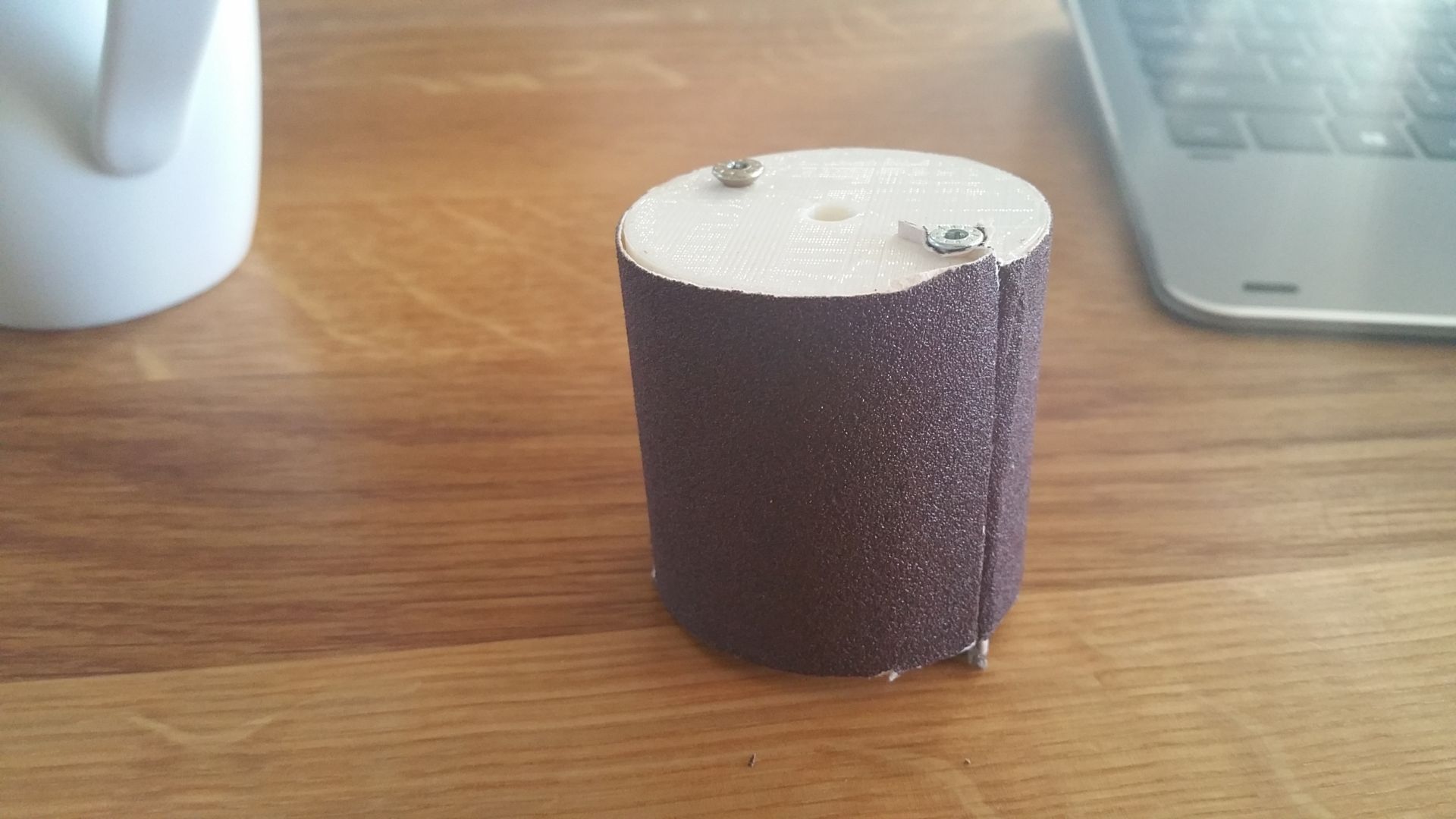 Bei der Vorbereitung für das Finnen einkleben musste ich leider feststellen, das dass Bluetube-Rohr an den Slots etwas "aufgequollen" ist und ich das Motorcasing nur noch schwer einschieben kann. Da ich zum Kleben ein Backpapier um das Casing wickeln wollte und das ganze ins Motorrohr passen muss werde ich das Rohr innen etwas ausschleifen. Um das Ganze nicht schwieriger als nötig zu gestalten habe ich schnell einen 50mm Zylinderschleifkopf gedruckt. Die Zeichnung: Trommel mit 120 Band. Die Schrauben halten das Schleifpapier in der Nut fest: Verdrehsicherung: fertig: Das schleifen war die reinste Freude  Jetzt past der Kram.