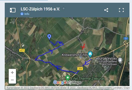 Zum Thema Anfahrt für diejenigen, die noch nicht da waren und auch für die anderen ein Hinweis zu einer Sperrung (war zumindest vor ein paar Wo noch so): auf der Website LSC Zülpich kann man auch die allgemeinen Daten unter Anfahrt, der Weg am Krewelshof vorbei (s. Bildausschnitt) war aber vor ein paar Wo noch gesperrt (rotes Kreuz), daher bitte der blauen Linie folgen und hintenrum den Feldweg anfahren. Grüße Thomas