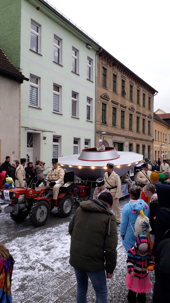 Wenn die Trillerpfeifen nicht schwarz, sondern rot wären, könnte das der Wagen von ver.di sein.