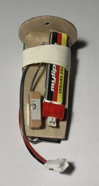 Hier ist eine Variante des Tracking-Senders eingebaut, die etwas kürzer, dafür aber breiter ist und statt einer einfachen Drahtantenne eine Wendelantenne hat. Der GPS Empfänger Beitian BN220 wäre zu groß. Es kommt daher ein kleinerer zum Einsatz. Mit zwei Schrauben wird der Einschub in der Spitze befestigt, womit auch gleich ein Ankerpunkt zur Befestigung des Schockbands zur Verfügung steht.